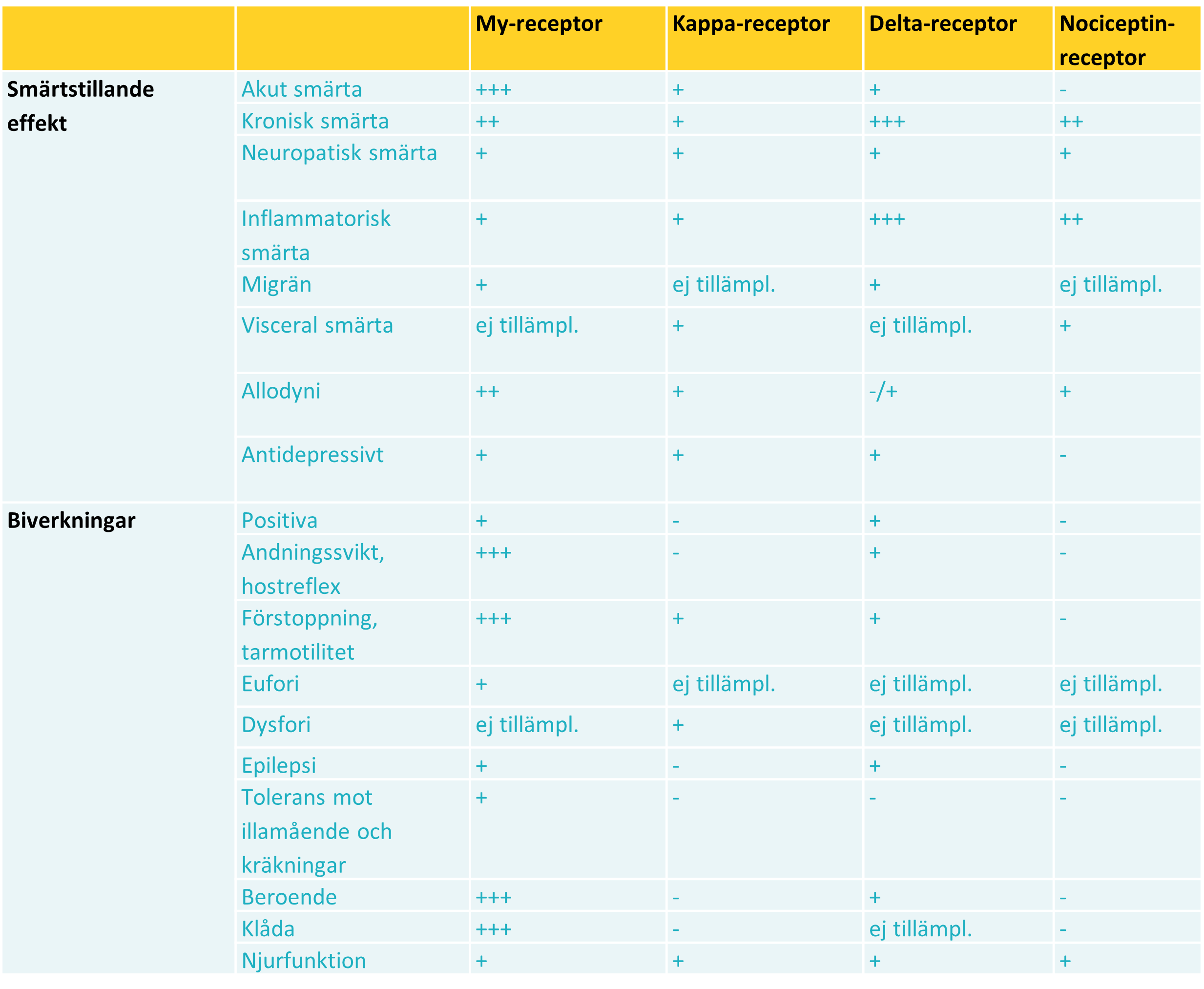 Kliniskt rapporterad smärtstillande effekt och biverkningar per opioidreceptorgrupp.4